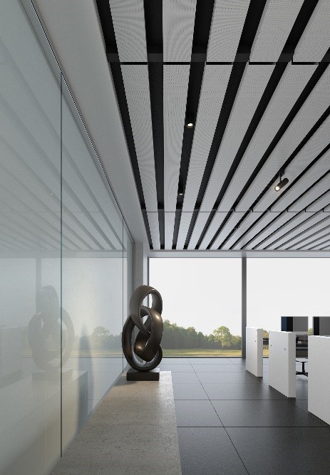 Le nouveau système de plafond ili répond à ces exigences. Il s'agit d'un système de plafond semi-ouvert composé de panneaux et de lames, créant un motif varié d'aspect industriel. Ils présentent des propriétés acoustiques très performantes grâce à l'intégration de laine minérale. Combinées au fait qu'elles sont entièrement perforées, elles réduisent les sons réverbérés et améliorent le confort sonore de n'importe quelle pièce. ​
